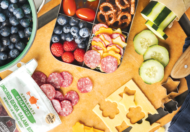 Adding APPLEGATE ORGANICS® Genoa Salami Bites to a bento box can fuel kids with quality protein that is casein, dairy, GMO and gluten free.