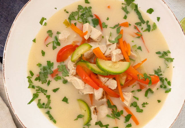 - Add the chicken, carrot, red bell pepper, coconut milk and curry paste and simmer until the vegetables are crisp-tender, about 5 minutes.